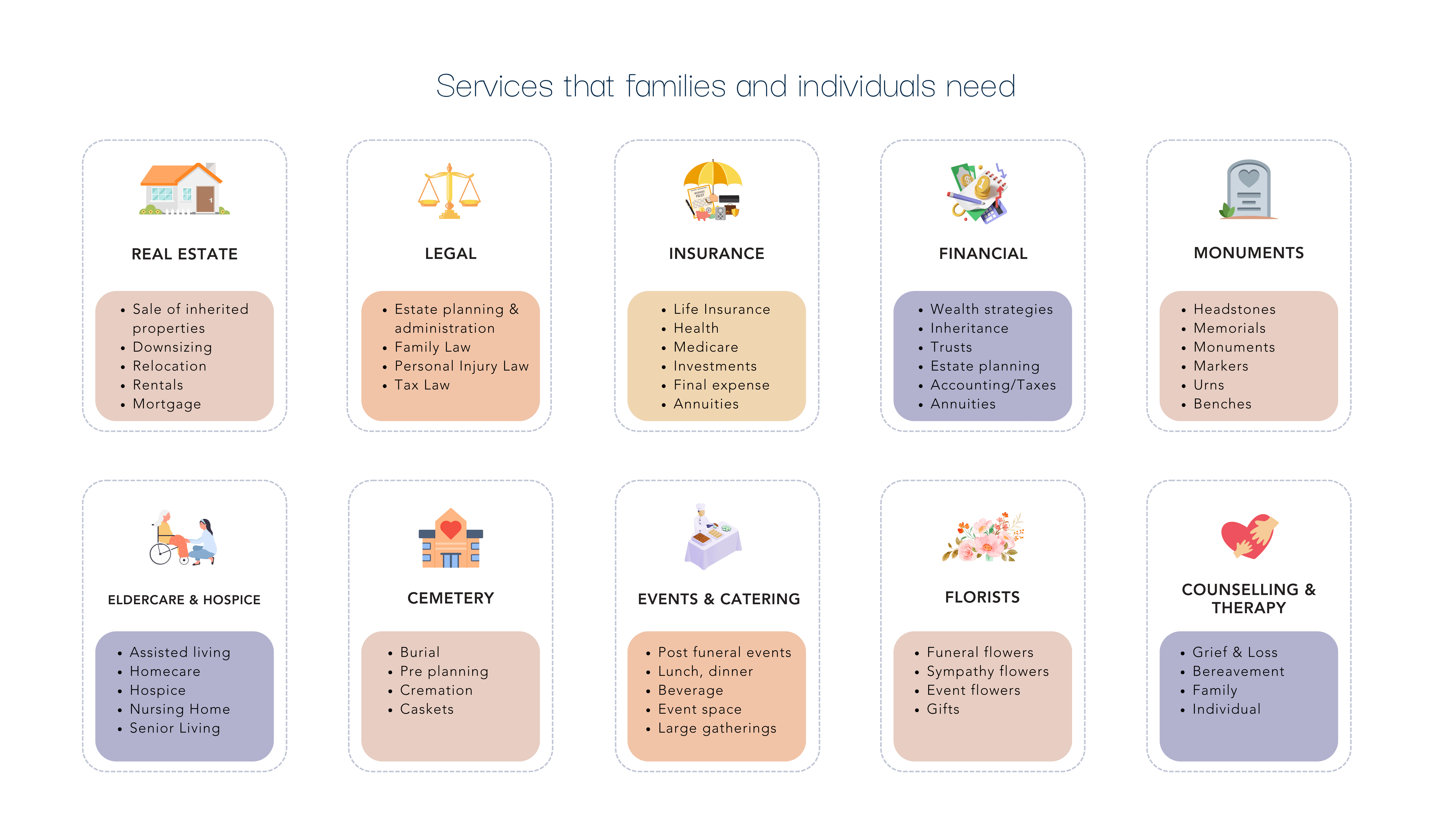 Amidst coping with a myriad of emotions, families often find themselves needing to plan, organize, and absorb a considerable amount of information. It is precisely during these times that families also require immediate assistance from other local, aligned businesses. See the graphic below for more details.